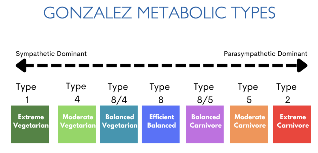 Dr. Gonzalez diagnosed his patients by metabolic type on a scale from Sympathetic Dominant (more vegetarian) to Balanced and Parasympathetic Dominant (more carnivore). In partnership with Dr. Kelley's team, we have developed an online, multiple-choice test where you can learn which foods are best for you and receive an 18 page, detailed nutritional plan based on your metabolic type. Learn more about the Gonzalez Metabolic Type Test here.